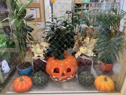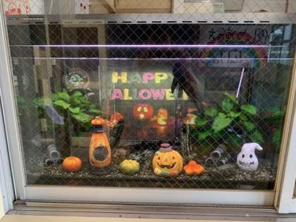 管理作業員室前のデコレーションがハロウィンバージョンに変わっています。管理作業員さんありがとうございます。