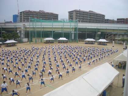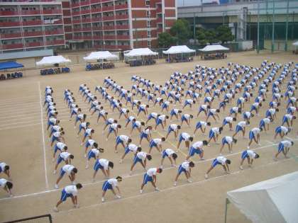 1 準備体操 八阪中学校伝統の縦横斜めのラインもしっかりそろっています。