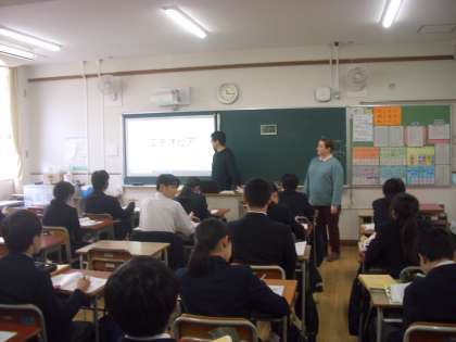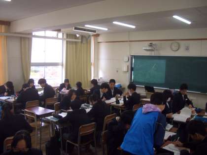 写真上から、3年生英語、3年生数学、1年生理科の授業の様子です。