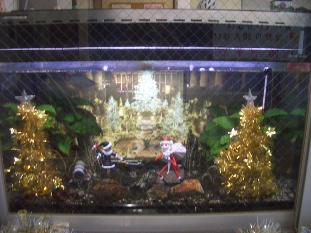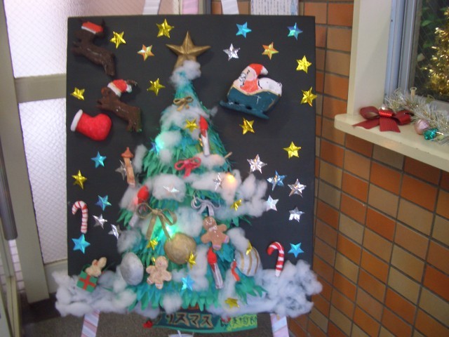 玄関横、管理作業員室前の水槽のデコレーションがクリスマスバージョンになりました。またその横には(写真右)美術部作成のクリスマスモニュメントが飾られています。管理作業員さん、美術部の皆さん、ありがとうございました。