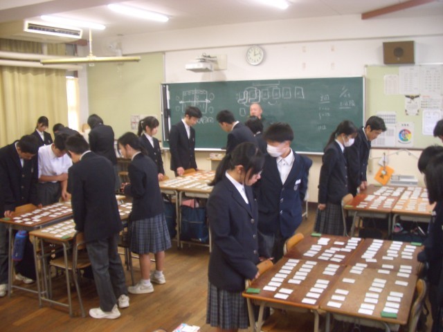2年生の数学はプロジェクターと板書でわかりやすく説明されています。国語は1年同様、百人一首の練習中です。盛り上がっています。