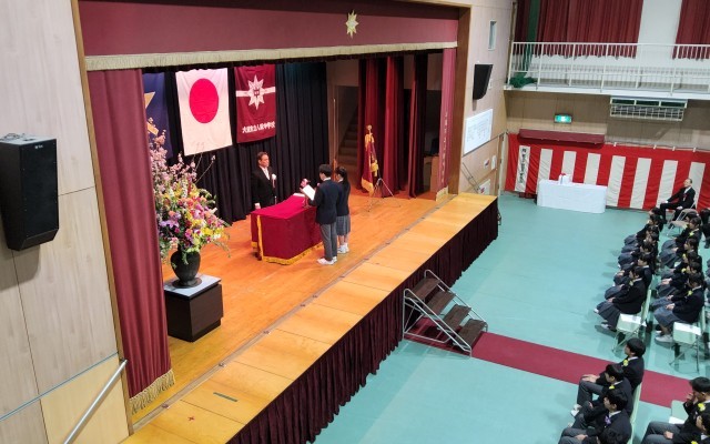 今日私たち79期、158名は希望を胸に思い出の詰まった学校を旅立ちます。入学後すぐの一泊移住、クイズやレクリエーションで話ししたことのなかった仲間と心を通わせ、中学生の第一歩を踏み出しました。プレゼン八阪、1年の合唱は歌い切りました。2、3年で取り組んだ劇「えんとつ町のプぺル」では、いろいろたいへんなこともあったけど、演者と裏方が融合し1つになって大成功を収めることができました。八阪中の伝統を背負った体育大会、とくに3年時、クラス関係なく応援し、勝ち負けに関係なく笑いあった瞬間に仲の良さがあふれていました。修学旅行では、しまなみ海道サイクリング、吉野川でのラフティング、レクリエーション大会、松山試市内散策と自然を満喫しました。田植え体験後に自分たちが植えた苗から収穫した米が届き、その味に感動しました。部活動・委員会活動での「縦のつながり」の強さも八阪中学校の強みで、自分たちが3年生になってからは、責任感を持って活動できました。いつも真剣に向き合ってくれた先生方には感謝、家族にも普段口にできないけど感謝しています。育ててくれてありがとう。3年間の学びを思い出し、明るい未来へ歩み続けます。お世話になったすべてのみなさんに感謝しています。