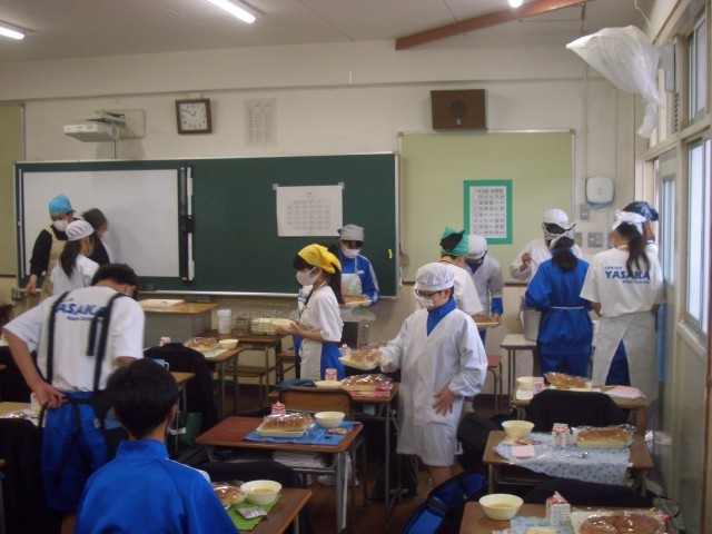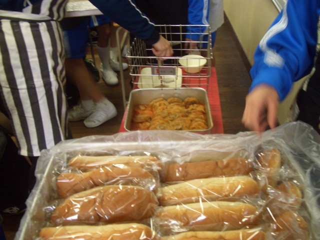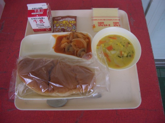 1回目の給食、献立は、煮こみハンバーグ、コーンスープ、おさつチップス、黒糖パン、スライスチーズ、牛乳です。美味しくいただきました。