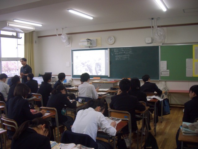 写真上から、英語、数学、社会、保健体育(男子)、(女子)の授業の様子です。