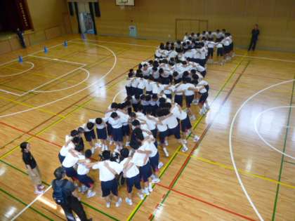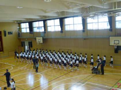 体育館では行進、大縄跳び等の流れを確認しました。