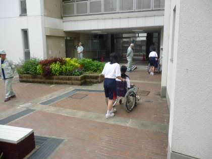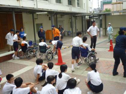 車イス体験、アイマスク体験、高齢者疑似体験、土のう作り