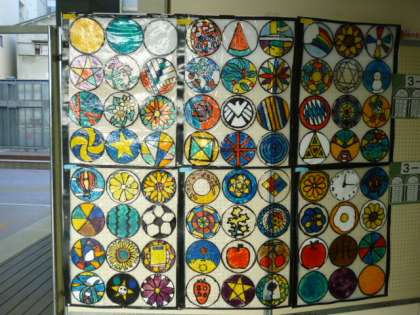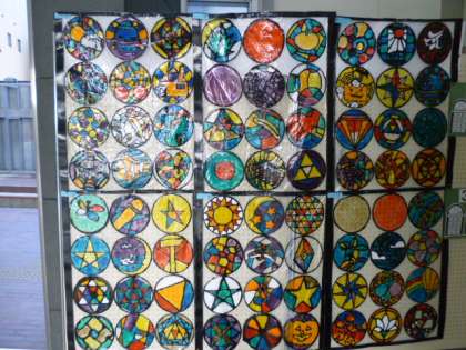 アカデミックデイで体育館に展示していた3年生のステンドグラスを玄関に展示しています。
