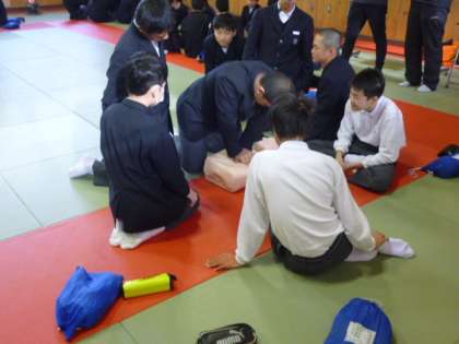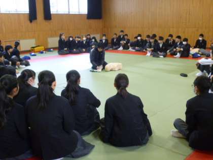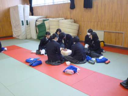 今日は1時間目〜3時間目に2年生が心肺蘇生法の講習を受けています。