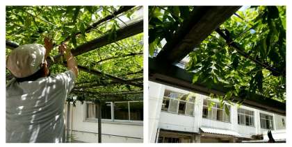 中庭にある藤棚は、地域のボランティアの方に手入れしていただいています。つるの先端を剪定して、花芽が十分な栄養を使えるようにしています。