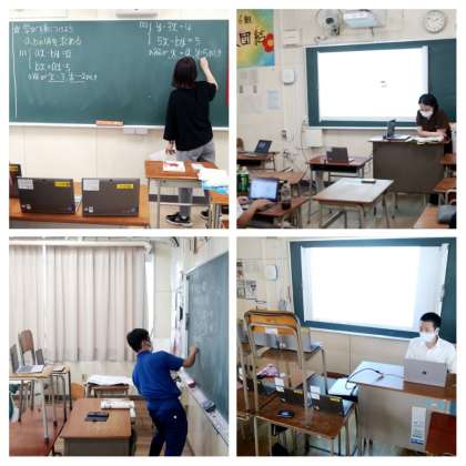オンライン朝学活、オンライン授業をしました。写真は、5限の各学年のようすです。教室では、パソコンのカメラを前に置いて、授業をしました。
