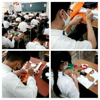フェルトでコースターを製作しています。切り取ったフェルトを縫い合わせて、果物のデザインに仕上がります。