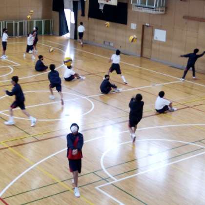 バレーボールをしました。授業の最初に動画を見て、競技の基礎を学びました。その後、ペアになってアンダーハンドパス、オーバーハンドパスの練習をしました。
