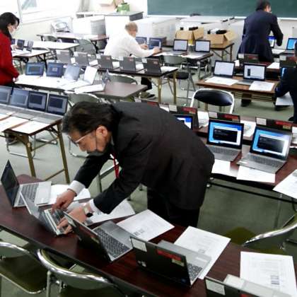 大阪市立小中学校では現在、教育ICT環境を改善し、利便性を向上させるために、ネットワークの再構築を進めています。本校では、今週月曜から作業に入り、本日までにすべての学習者用端末(生徒が利用するノートパソコン)を設定変更しています。委託事業者が作業をしています。