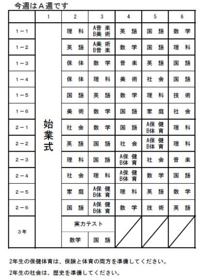 1月12日(水)時間割 公開日 2022/01/11 更新日 2022/01/11 出来事 1月12日(水)時間割は、次のとおりです。 なお、1・2年生は給食があります。3年生は給食がありません。 いいね(0)