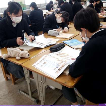 木彫パズルを制作します。今日の授業では、パズル全体のデザインを考えました。美術室の資料や図鑑、班員のデザインも参考にして、発想を広げていました。