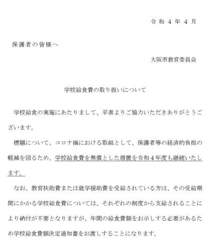 学校給食費の取り扱いについて、大阪市教育委員会から通知がありましたのでお知らせします。