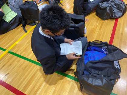 事前指導では、追加・変更点の確認をしました。また、雨が降るなか持参した荷物を確認しました。必要なものがカバンの中にあるかどうかを、カバンからは出さないで確認しました。