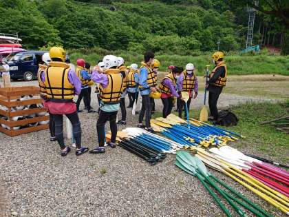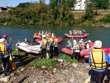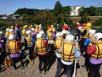 真夏のような日差しのなかのラフティングに生徒たちは大喜びです。