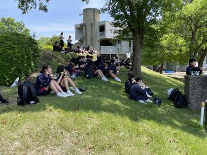 学級写真の後は、お昼ごはん。木陰でお弁当を食べました。