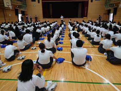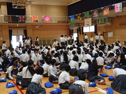 2年生が学年集会で学級旗コンクールの投票を行いました。