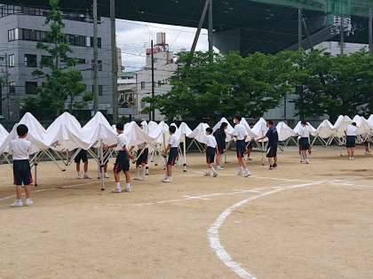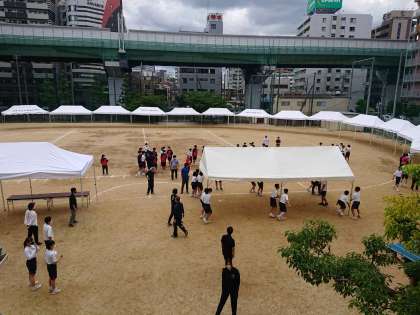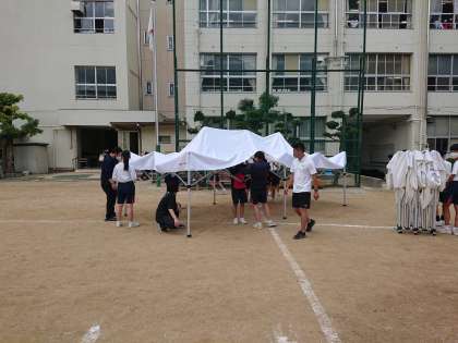 放課後、1・2年生、部活動の生徒を中心に、明日の予行練習に向けてテント張りを行いました。