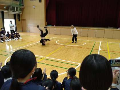 本校は2年生を対象に、世界的に活躍されている2名のダンサーさんに来校していただき、「ブレイクダンス」を体験しました。