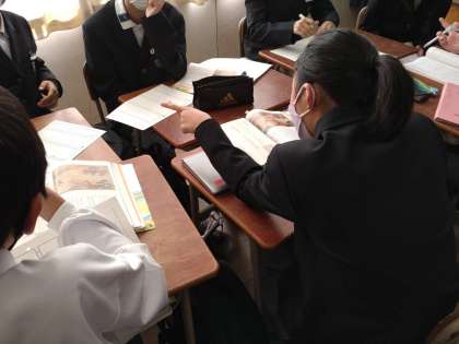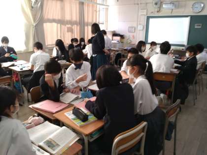 別れの場面での三人の登場人物の心情について、班に分かれて話し合いました。