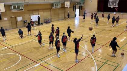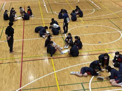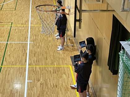 チームミーティングで、今日の目標や作戦を考えた後、チームに分かれて練習しました。対戦の様子を学習者用端末(ノートパソコン)で撮影し、できた点や改善点を話し合いました。全体ミーティングでは、各チームのキャプテンが振り返り内容を発表しました。