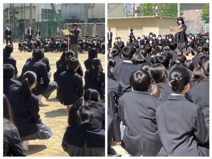 対面式は、生徒会役員の進行で行われ、在校生代表が「歓迎の言葉」、新入生代表が「誓いの言葉」を述べました。