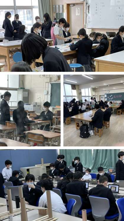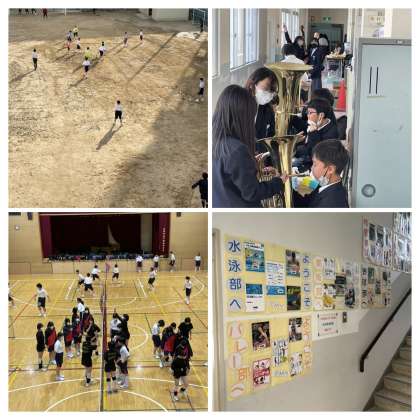 1年生が仮入部で部活動を体験しています。先輩から優しくアドバイスされて、部活動に参加しています。