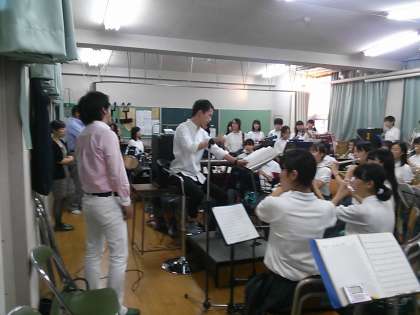 芸術鑑賞会で歌を披露する歌手の西浦達雄さんが、吹奏楽部との音合わせのために来校してくださいました。