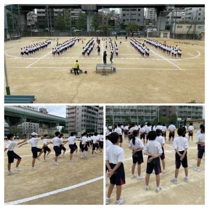 1年生が学年練習を行いました。入場行進の練習では、目線や指先にも気を配って行進しました。