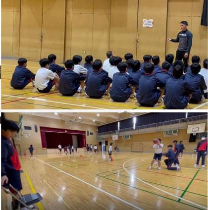 バスケットボールをしました。学習者用端末(ノートパソコン)を用いて動画を撮影し、視覚的に自分のフォームを確認し、セットシュートでまっすぐできるよう修正しました。