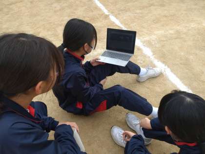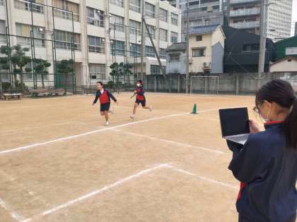 学習者用端末を活用し、バトンパスの様子を動画撮影しています。