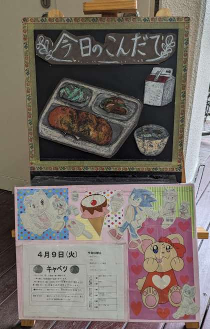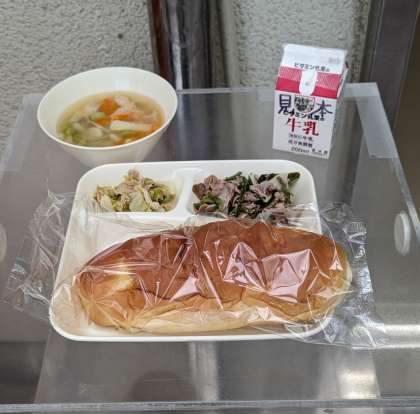 豚肉のガーリック焼き スープ ツナとキャベツのソテー おさつパン 牛乳