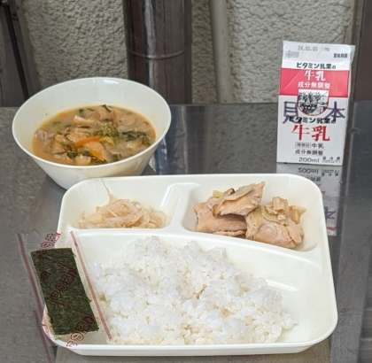 焼きとり みそ汁 もやしのゆずの香あえ 焼きのり ごはん 牛乳