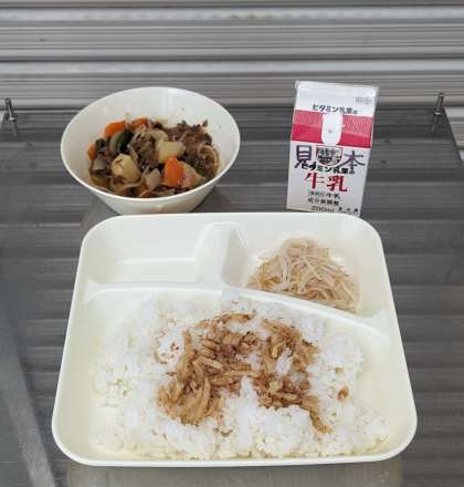 みそ肉じゃが もやしの甘酢あえ ごまかかいため ごはん 牛乳