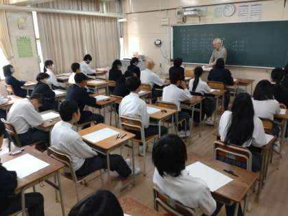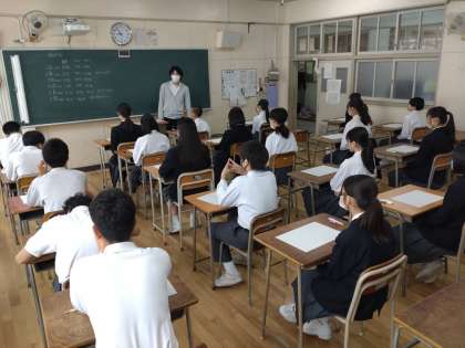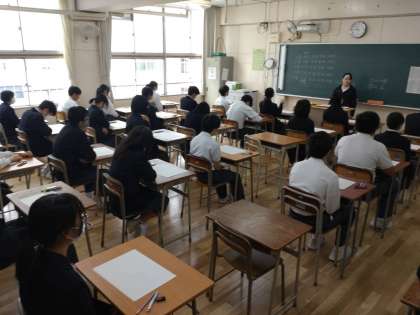写真は、1時間目国語のテスト直前の様子です。教室は、定期テストとは違った緊張感が漂っていました。