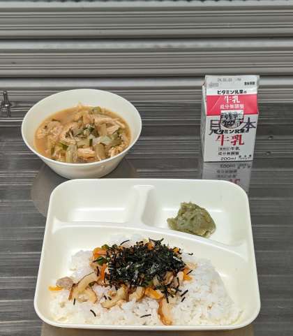 かやくご飯 きざみのり みそ汁 まっ茶ういろう 牛乳