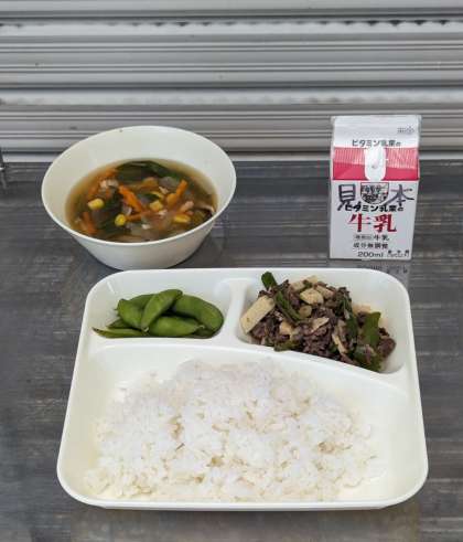 チンジャオニューロウスー 中華みそスープ えだまめ ごはん 牛乳