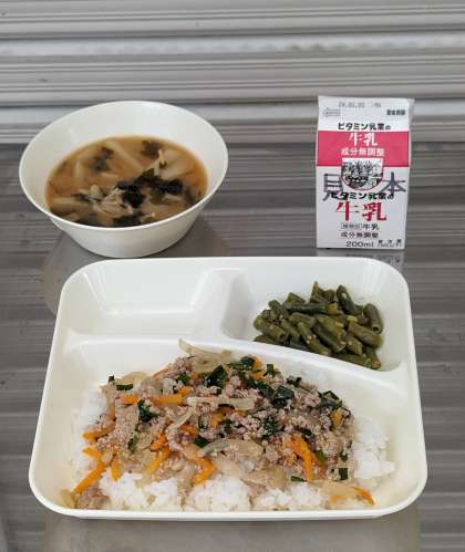 豚ひき肉とにらのそぼろ丼 じゃがいものみそ汁 さんどまめのごまあえ ごはん 牛乳