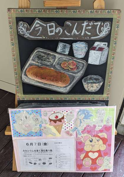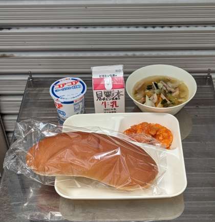 えびのチリソース 中華スープ ヨーグルト コッペパン 牛乳
