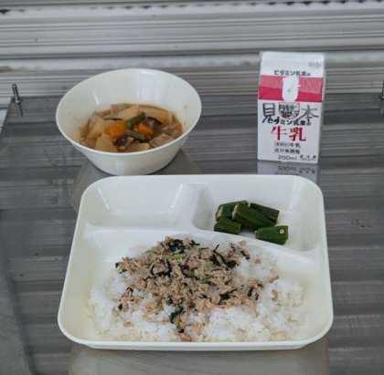 鶏肉と野菜のみそ煮 オクラの梅風味 ツナっ葉いため ごはん 牛乳