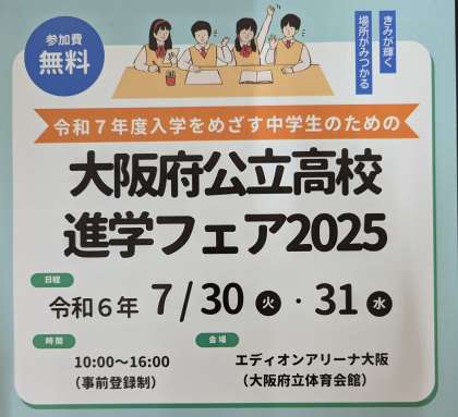 3年生を対象とした、大阪府公立高校進学フェアの案内が届きました。7月30日(火)、31日(水)の2日間、エディオンアリーナ大阪(大阪府立体育館)で行われます。