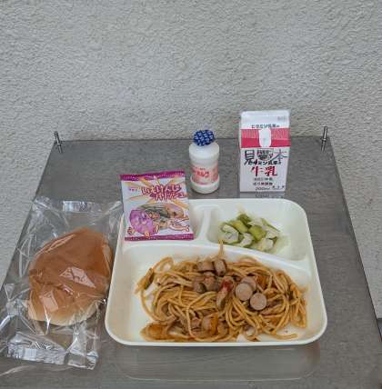 チキントマトスパゲッティ グリーンアスパラガスとキャベツのサラダ 発酵乳 いもけんぴフィッシュ ミニコッペパン 牛乳