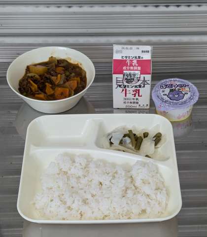 ビーフカレーライス 野菜のピクルス ぶどうゼリー ごはん 牛乳