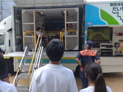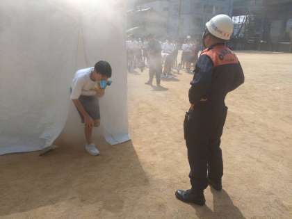 〇グラウンドでは、「起震車」・「水消火器」・「煙中」を体験しました。