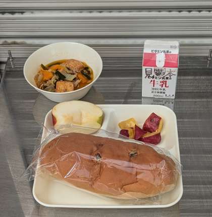 中華煮 大学いも りんご レーズンパン 牛乳