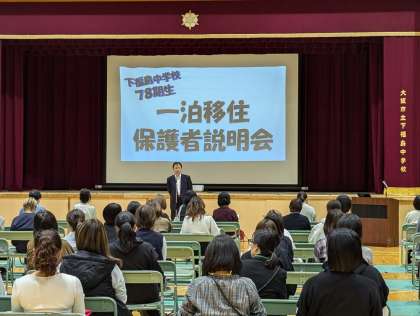 本日1年生の一泊移住保護者説明会を行いました。お忙しい中、お集まりいただいた保護者の皆様、ありがとうございました。なお、本日欠席された方には、お子さまを通じて明日資料を配付いたしますので、ご確認お願いいたします。
