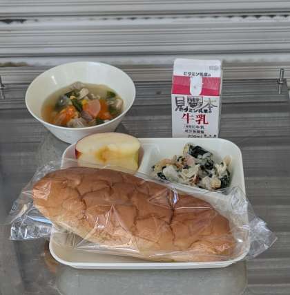 ほうれんそうのグラタン スープ煮 りんご おさつパン 牛乳